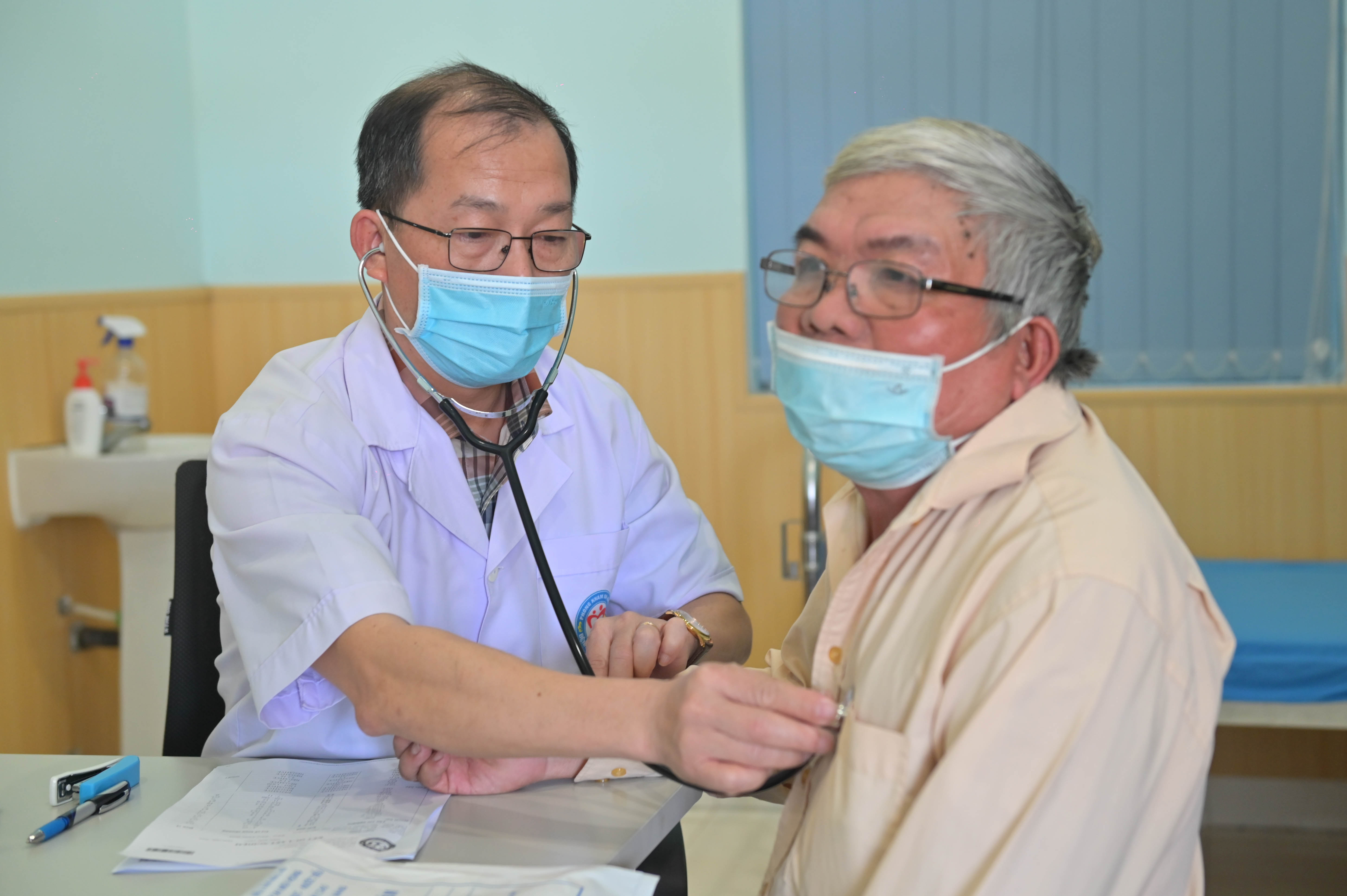 | Bác sĩ Thái Đàm Lương - Bệnh xá trưởng Bệnh xá Lữ đoàn 101 khám bệnh cho người dân. |