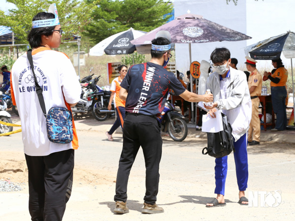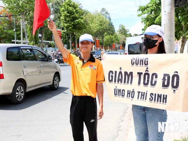 Các tình nguyện viên ra hiệu thông báo để các phương tiện giảm tốc độ khi qua điểm thi Trường THPT Nguyễn Trãi (Tp.Phan Rang-Tháp Chàm). Ảnh: Văn Nỷ