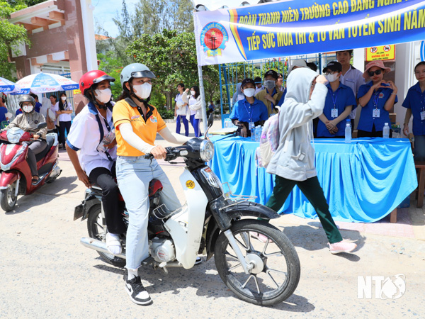 Các tình nguyện viên tại điểm Trường THCS-THPT Trần Hưng Đạo (Tp.Phan Rang-Tháp Chàm) dùng xe gắn máy chở các thí sinh ở xa về nơi nghỉ trọ an toàn. Ảnh: Văn Nỷ