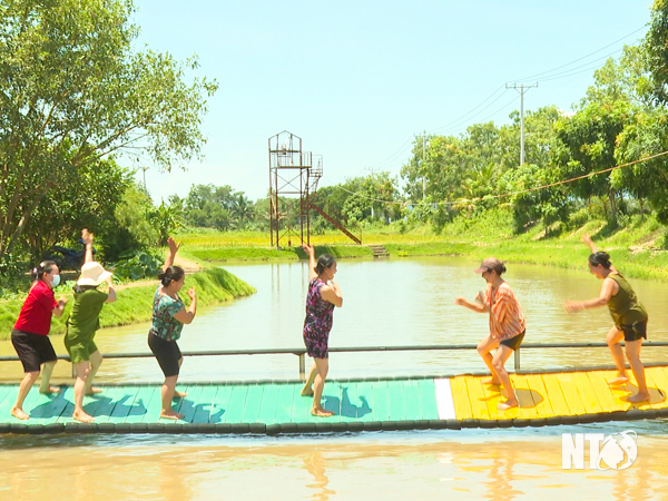 Du khách trải nghiệm trò chơi cầu lắc rơi xuống nước tại Charm Charm Ninh Thuận của Hợp tác xã Du lịch nông nghiệp Lâm Sơn (Ninh Sơn). Ảnh: Kim Thùy