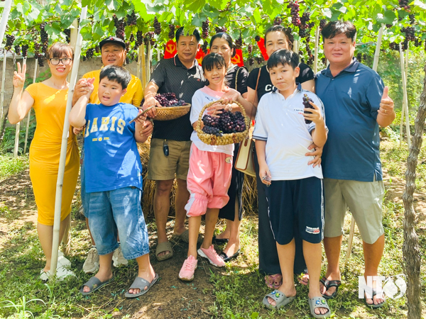 Du khách thích thú trải nghiệm cắt nho tại Nông trại Hoàng Yến ở xã Phước Thuận (Ninh Phước). Ảnh: Văn Nỷ