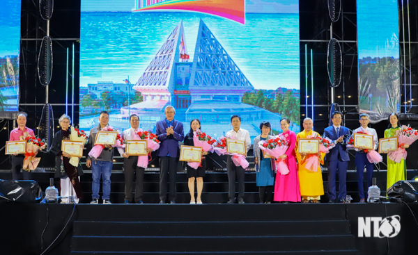 Các đồng chí: Lê Văn Bình, UVTV Tỉnh ủy, Chủ tịch Ủy ban MTTQ Việt Nam tỉnh; Châu Thị Thanh Hà, UVTV Tỉnh ủy, Bí thư Thành ủy Phan Rang-Tháp Chàm trao giấy khen cho tập thể, cá nhân có thành tích xuất sắc đóng góp vào quá trình xây dựng và phát triển thành phố năm 2024.