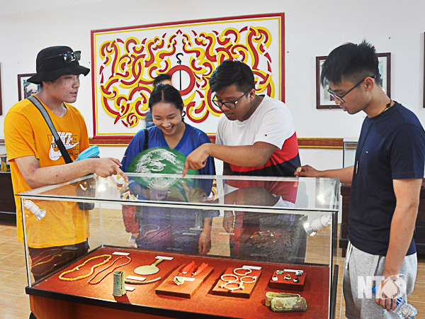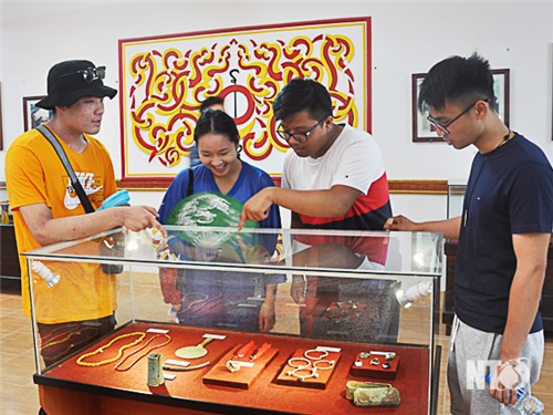 Du khách xem trang sức truyền thống của đồng bào Chăm.