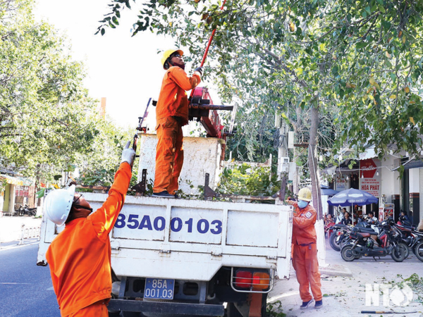 Công nhân Điện lực Ninh Thuận tỉa cây bảo đảm an toàn nguồn điện phục vụ nhân dân đón Tết.