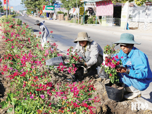 Các tuyến đường thuộc trung tâm huyện Ninh Sơn được trồng hoa và cây cảnh đón tết.