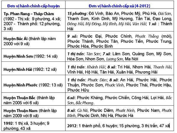 Qua 20 năm tái lập (1992 – 2012) từ 4 đơn vị hành chính trực thuộc (một thị xã và 3 huyện, với 52 đơn vị hành chính cấp xã) đến nay tỉnh Ninh Thuận đã tăng lên 7 đơn vị hành chính trực thuộc (1 thành phố: Phan Rang – Tháp Chàm và 6 huyện: Bác Ái, Ninh Hải, Ninh Phước, Ninh Sơn, Thuận Bắc, Thuận Nam, với 65 đơn vị hành chính cấp xã, bao gồm 15 phường, 3 thị trấn và 47 xã).