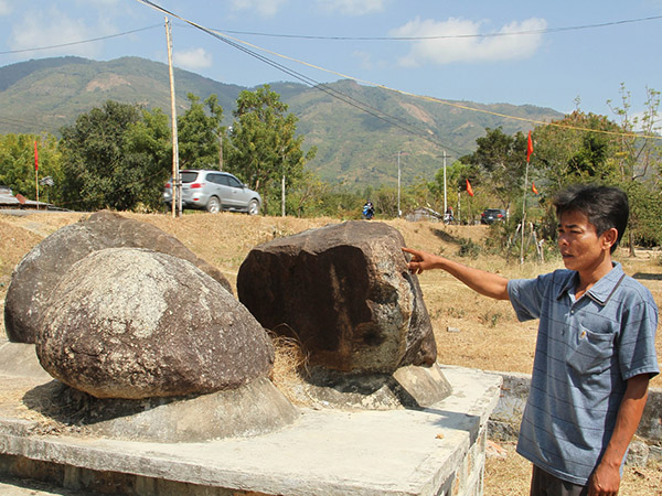 Anh Hòa nhiệt tình đưa chúng tôi đến thăm Đá Ba Cái nằm trong khuôn viên Nhà cộng đồng khu dân cư dưới chân núi Ma Dú. Chỉ tay lên 3 hòn đá được đặt trên bệ xi măng cao khoảng 1 mét, anh Hòa cho biết từ thuở xa xưa Đá Ba Cái nằm cạnh đường giao thông nội thôn. Khi giải phóng mặt bằng thi công quốc lộ 27 B, Đá Ba Cái được di dời vào nhà cộng đồng, mỗi hòn đá có chiều dài khoảng 1 mét, cao khoảng 0,6 mét. Đây là địa chỉ văn hóa của đồng bào Raglai các địa phương trên địa bàn tỉnh đến thăm viếng vào những dịp lễ tết.