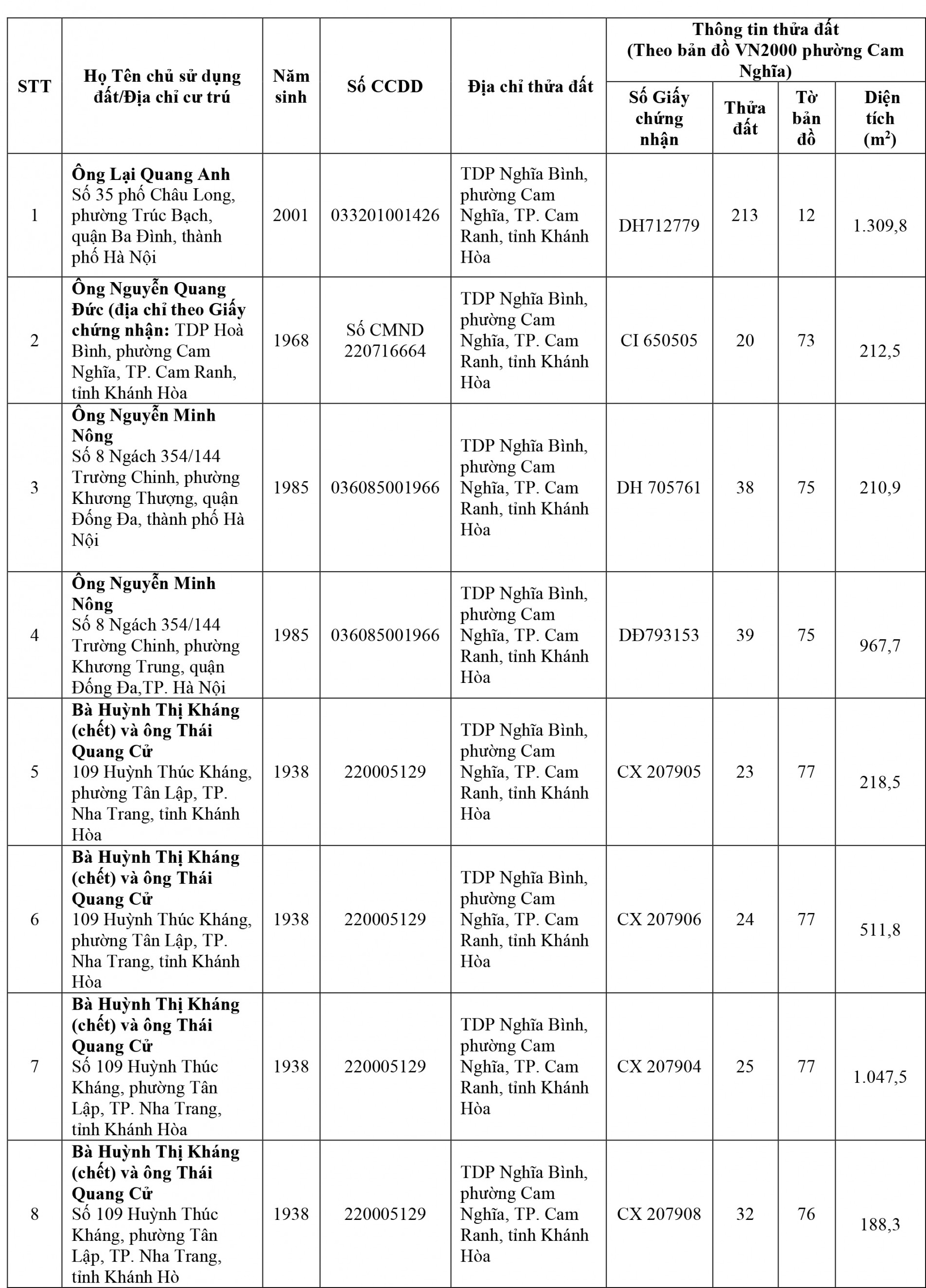 Quá trình thực hiện có 10 chủ sử dụng đất/17 thửa đất, UBND phường Cam Nghĩa không liên lạc được, không gửi được thông báo thu hồi đất cho người có đất thu hồi, chủ sở hữu tài sản gắn liền với đất, người có quyền lợi và nghĩa vụ liên quan (nếu có), cụ thể như sau: