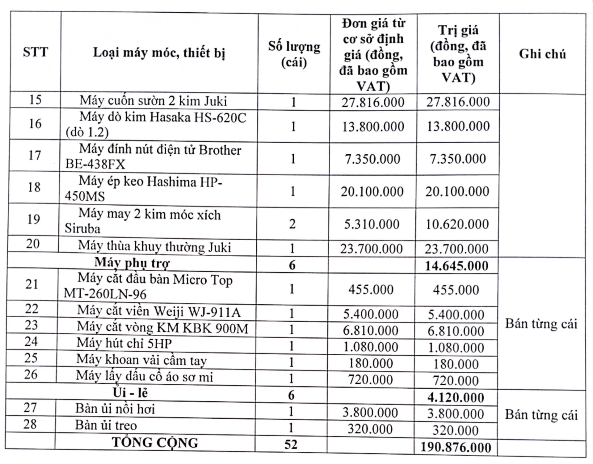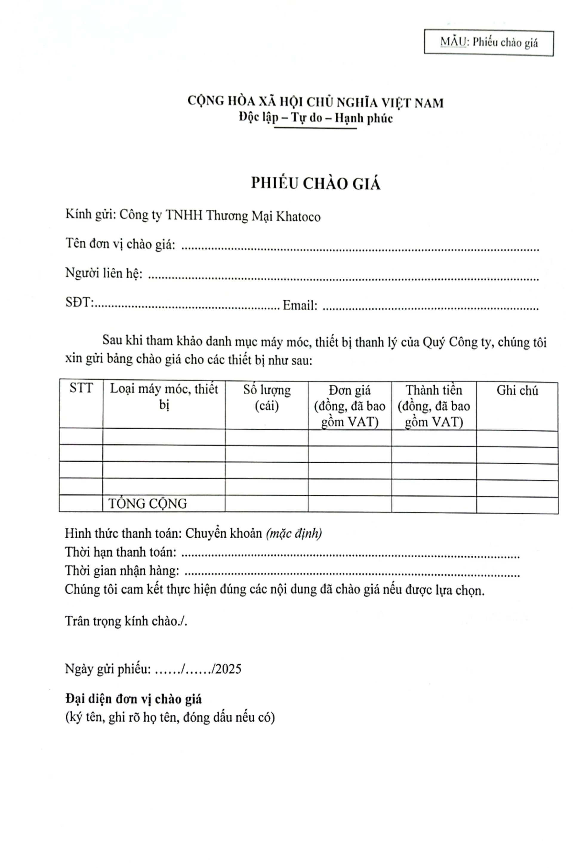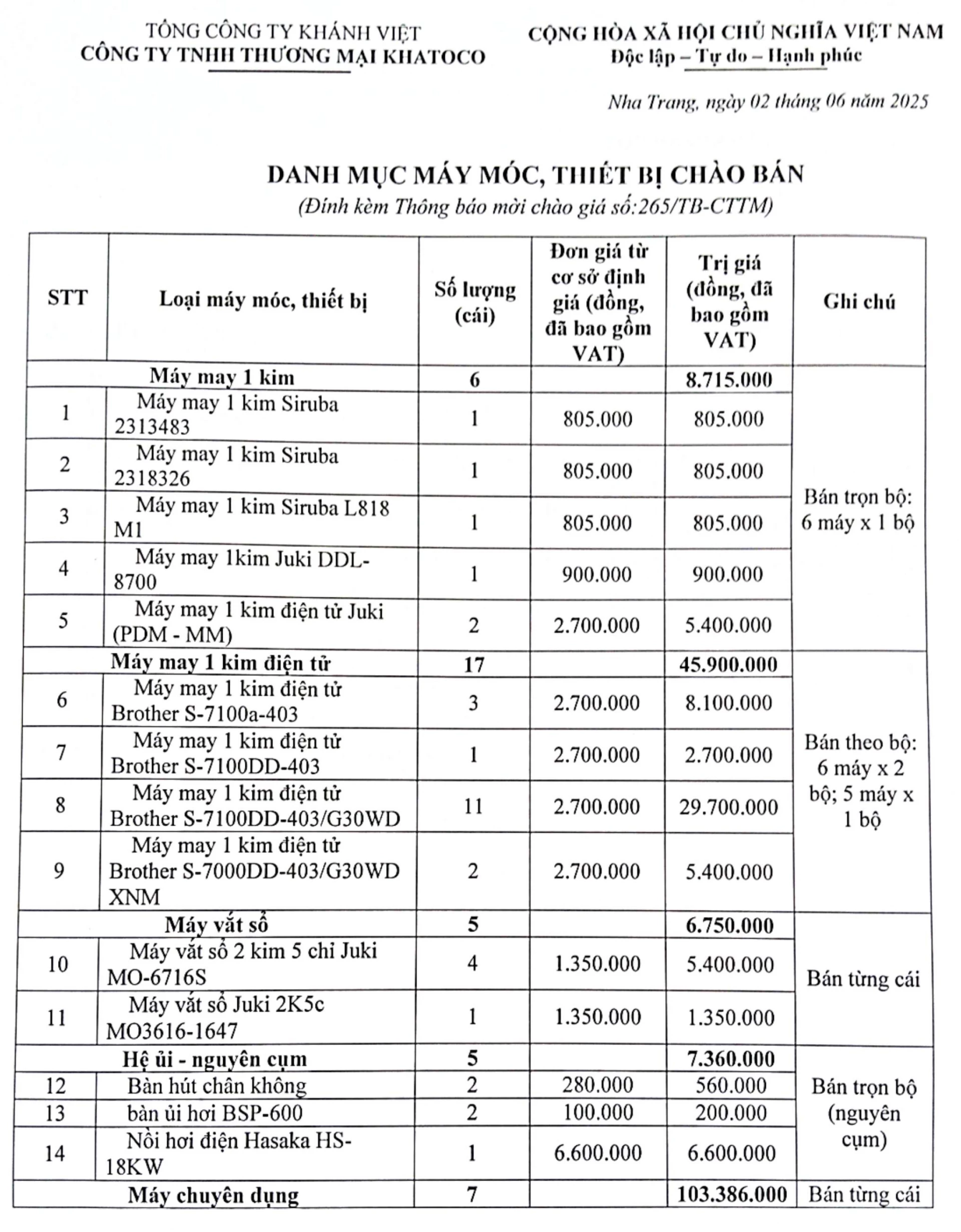 Công ty TNHH Thương mại Khatoco trân trọng thông tin: Chúng tôi có nhu cầu thanh lý một số máy móc, thiết bị phục vụ sản xuất may công nghiệp. Đơn giá tham khảo được xác lập theo chứng thư thẩm định giá; chi tiết ghi trong bảng “Danh mục máy móc, thiết bị chào bán” đính kèm.