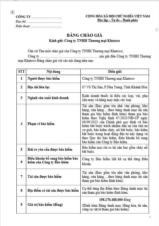 Công ty TNHH Thương mại Khatoco có nhu cầu mua Bảo hiểm mọi rủi ro tài sản bao gồm cháy nổ bắt buộc với nội dung cụ thể như sau: