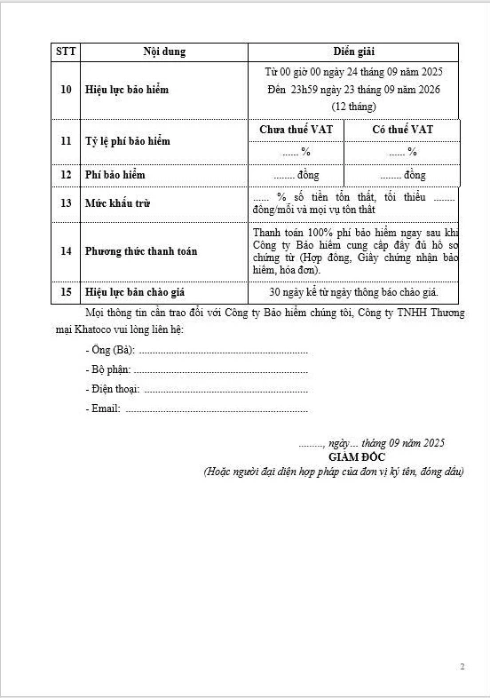 8. Khảo sát thực tế: Quý Công ty Bảo hiểm có nhu cầu cần khảo sát thực tế hoặc trao đổi các vấn đề liên quan, vui lòng liên hệ Ông: Nguyễn Thành Thái – Phòng Kế toán Công ty TNHH Thương mại Khatoco, điện thoại: 0903519229.