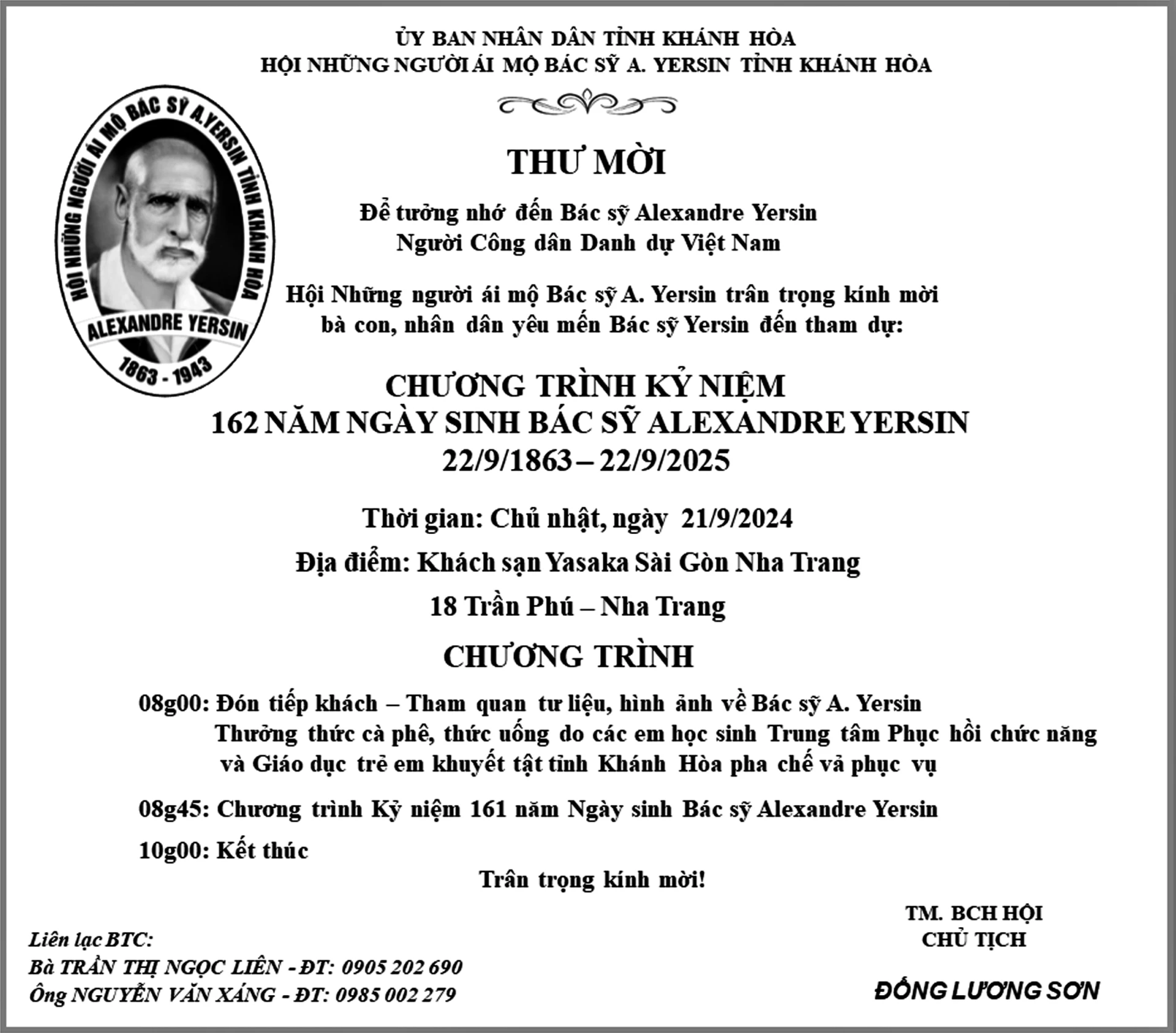 Thư mời tham dự Chương trình kỷ niệm 162 năm ngày sinh Bác sĩ A. Yersin