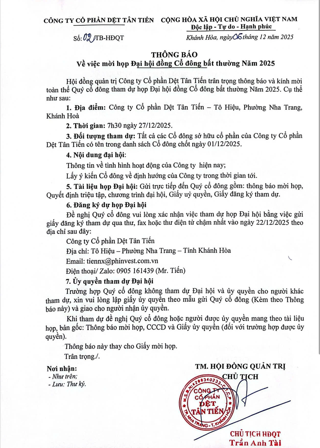 Công ty Cổ phần Dệt Tân Tiến mời họp Đại hội đồng Cổ đông bất thường năm 2025
