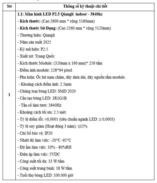 Công ty TNHH Thương mại Khatoco có nhu cầu đầu tư, lắp đặt 01 (một màn hình Led mới 100%, treo cố định tại vị trí trung tâm trên sân khấu Hội trường Văn phòng Công ty. Thông tin cụ thể như sau: