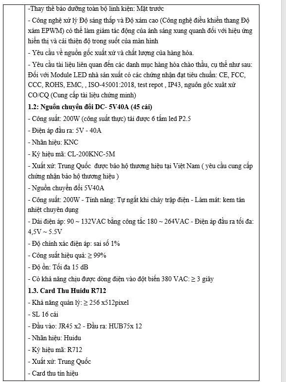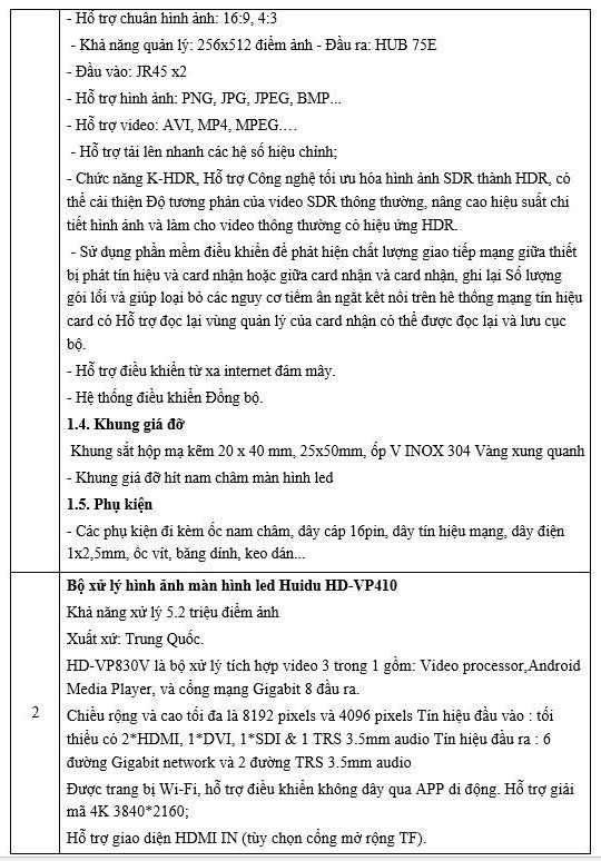 1. Giá chào: Là giá đã có thuế VAT bao gồm các bộ phận cấu thành như: Màn hình Led, bộ xử lý hình ảnh, khung giá đỡ, công lắp đặt và chi phí bốc xếp, vận chuyển.