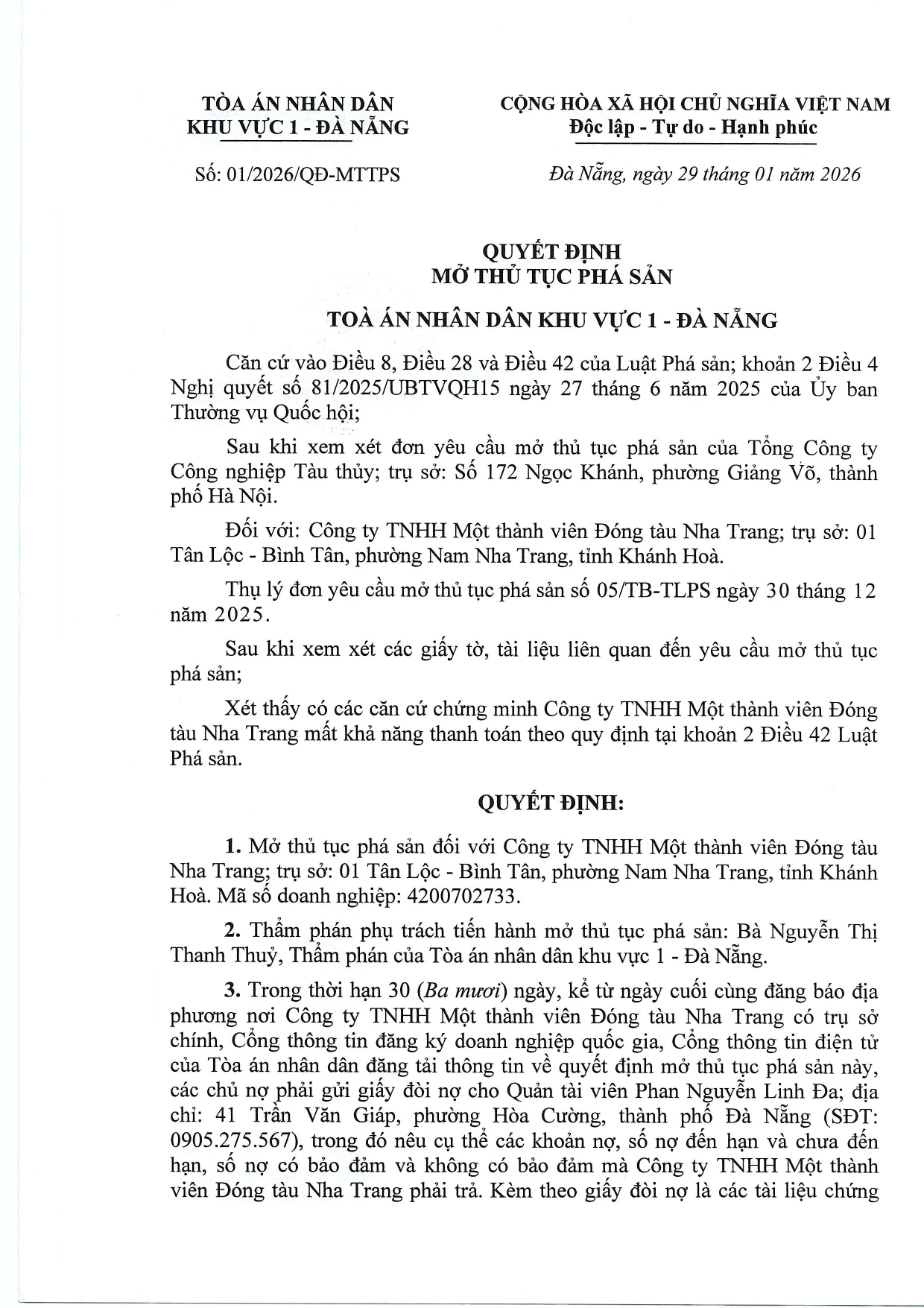 Quyết định mở thủ tục phá sản đối với Công ty TNHH Một thành viên Đóng tàu Nha Trang