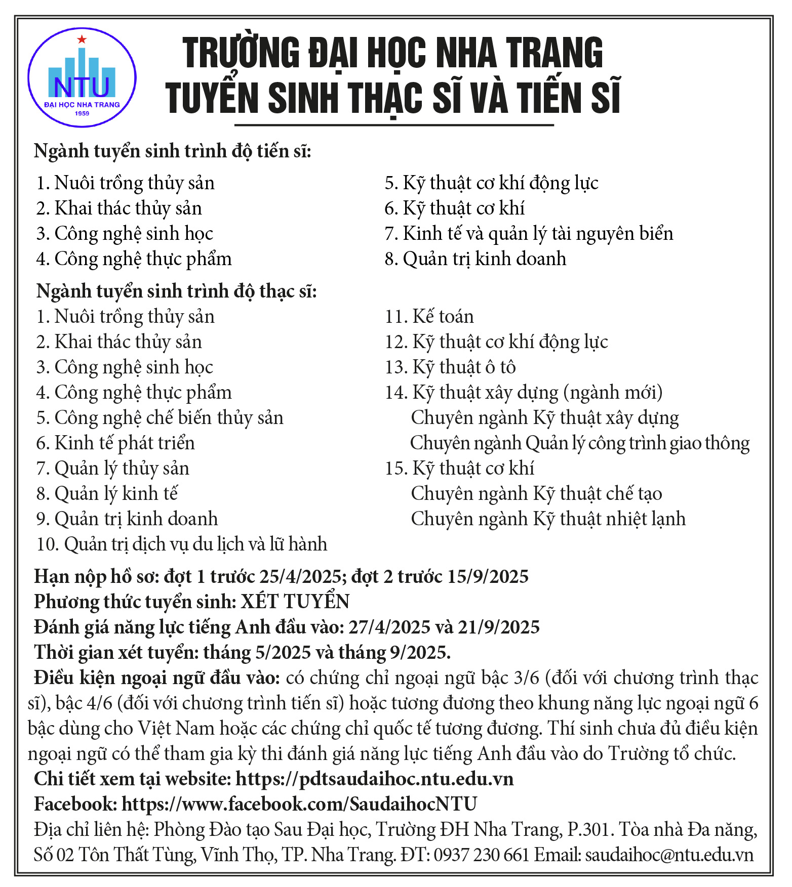 Trường Đại học Nha Trang tuyển sinh thạc sĩ và Tiến sĩ