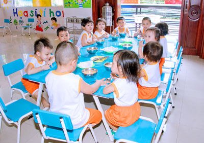 Chế độ ăn của trẻ phù hợp với lứa tuổi được cân đối lượng và chất theo phần mềm nutikid. Thực đơn được thay đổi từng ngày, thức ăn đa dạng phong phú, đầy đủ chất, vitamin và khoáng chất. Đặc biệt, trường thiết kế thực đơn riêng cho những bé cần chăm sóc đặc biệt và có chế độ đặc biệt với bé mới ốm dậy hoặc không tăng cân. Nhân viên nhà bếp dự các giờ ăn trong ngày của bé, lưu mẫu thức ăn đúng qui định, đảm bảo vệ sinh an toàn thực phẩm.