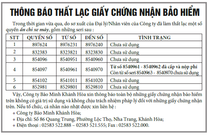 THÔNG BÁO THẤT LẠC GIẤY CHỨNG NHẬN BẢO HIỂM