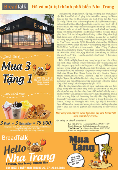 Khách sạn Yasaka-Saigon-Nhatrang khai trương cửa hàng BreadTalk vào ngày 26-1-2014.