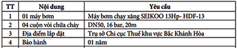 Cục Thuế tỉnh Khánh Hòa có nhu cầu mua máy bơm và các phụ kiện đính kèm với yêu cầu như sau: