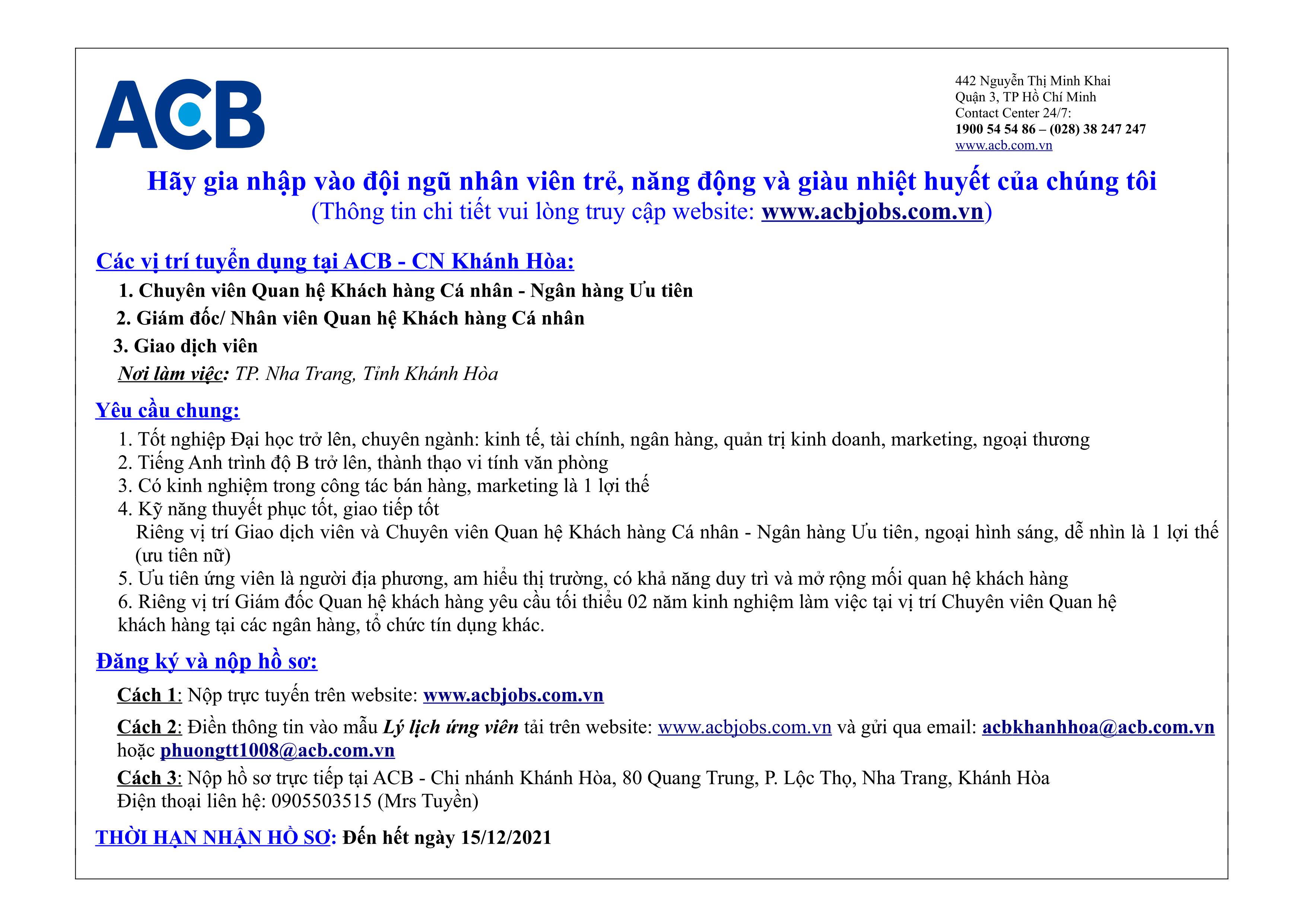 ACB - Chi nhánh Khánh Hòa tuyển dụng