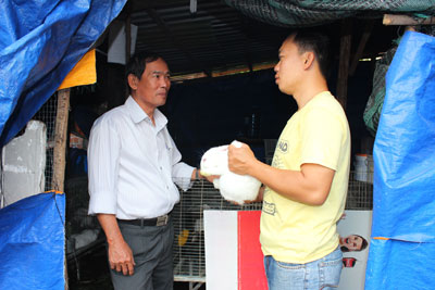 | Ông Cao Văn Niệm (bên trái) thăm mô hình nuôi thỏ thương phẩm của gia đình anh Trần Văn Quý. |