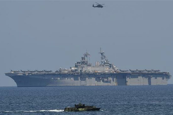 Tàu chiến và máy bay Mỹ tham gia tập trận quân sự thường niên Mỹ-Philippines ngoài khơi thị trấn San Antonio, tỉnh Zambales, Philippines ngày11/4/2019. Ảnh: AFP