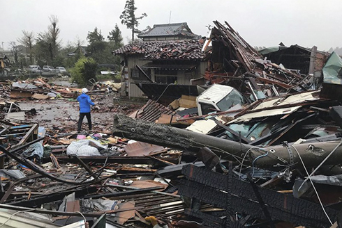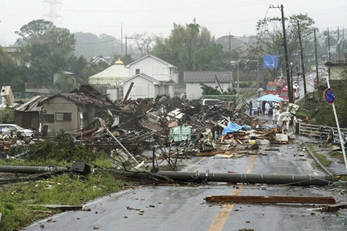 Nhà cửa, cột điện đổ sập do lốc xoáy ở khu Ichihara, phía đông Tokyo, Nhật Bản ngày 12/10 khi siêu bão Hagibis càn quét qua khu vực này. Ảnh: Reuters