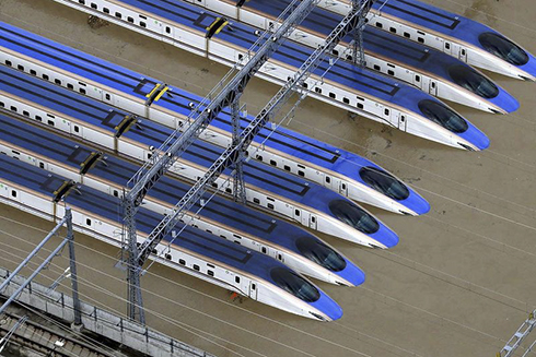 Những đoàn tàu Shinkansen ngập sâu trong nước khi bão Hagibis gây mưa lớn ở vùng Nagano. Theo trang Kyodo News, ít nhất 80 người bị thương và 370.000 hộ gia đình đang bị cắt điện do ảnh hưởng của cơn bão. Ảnh: Reuters