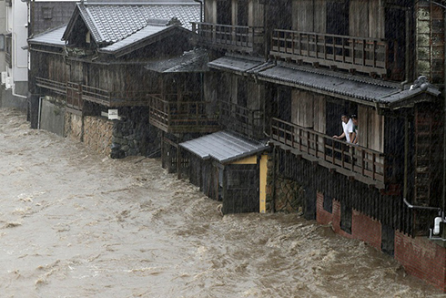 Những người dân ở tầng 2 của một ngôi nhà tại Hamamatsu, quận Shizuoka nhìn ra ngoài trời mưa lớn với con đường giờ đã biến thành sông. Ảnh: AP