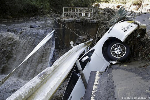 Một chiếc ô tô bị mắc kẹt trên con đường vừa hứng chịu một trận lở đất. Người phát ngôn chính phủ Nhật Bản Yoshihide Suga cho biết 27.000 quân lính và các nhân viên cứu hộ khác đã được triển khai để ứng cứu những người vẫn mắc kẹt trong vùng thiên tai. Ảnh: AP