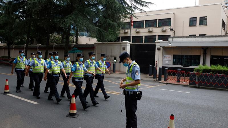 An ninh vẫn được thắt chặt bên ngoài Lãnh sự quán Mỹ ở thành phố Thành Đô, Trung Quốc trong ngày 26/7 trong bối cảnh các nhân viên Lãnh sự quán Mỹ tại đây chuẩn bị rời đi. Bên ngoài tòa Lãnh sự, cảnh sát được bố trí dày đặc, phong tỏa các con phố dẫn vào khu vực này.