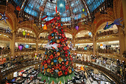 Cây thông “siêu to” dưới mái vòm trung tâm mua sắm Lafayette (Paris, Pháp).