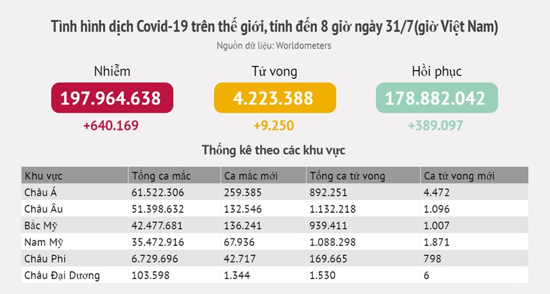 Tại châu Á, nhiều quốc gia trong những tuần gần đây phải đối mặt với một làn sóng nguy hiểm. Trước tình hình này, Philippines đã công bố kế hoạch phong tỏa vùng thủ đô Manila trong 2 tuần. Chính phủ Nhật Bản có kế hoạch ban bố tình trạng khẩn cấp tại 3 tỉnh gần Tokyo và tỉnh Osaka đến cuối tháng 8 tới.