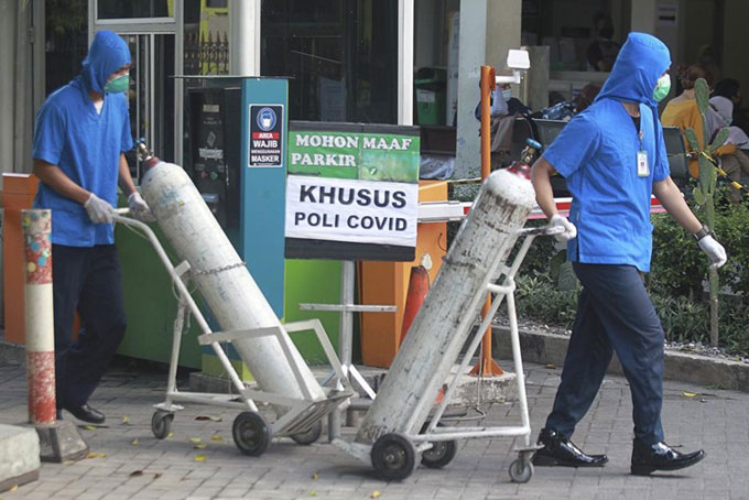 Nhân viên y tế chuyển bình chứa oxy tại Bệnh viện Sardjito tại Indonesia. (Ảnh: AP)
