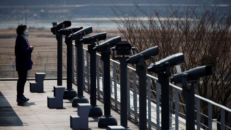 Người phụ nữ đứng trên một đài quan sát tại Paju, Hàn Quốc, gần Khu phi quân sự (DMZ), ngày 24/3/2021. (Ảnh: Reuters)