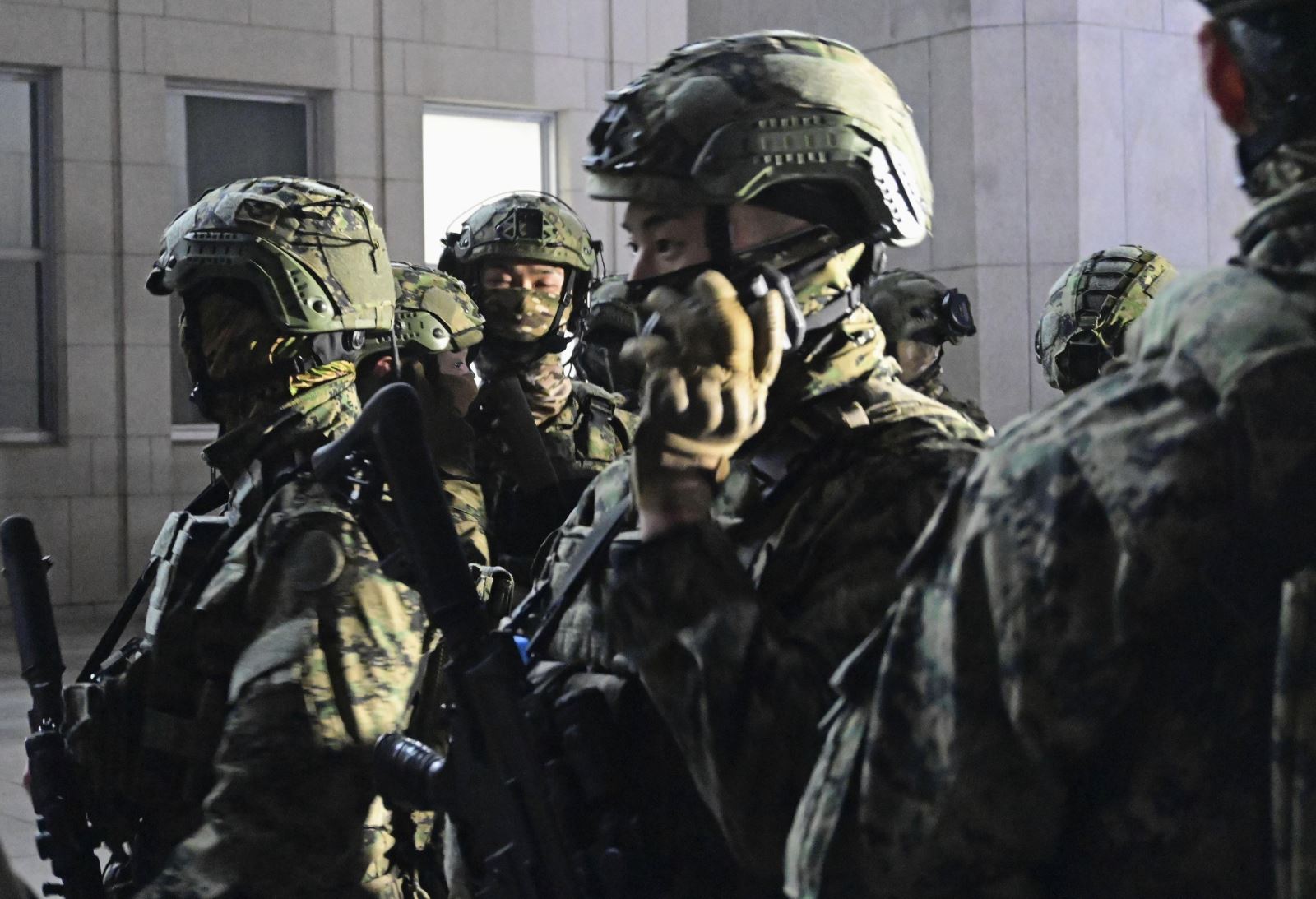 | Binh sĩ Hàn Quốc được triển khai bên ngoài tòa nhà Quốc hội ở Seoul sau khi Tổng thống Yoon Suk Yeol ban bố lệnh thiết quân luật, rạng sáng 4/12/2024. Ảnh: Kyodo/TTXVN |