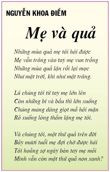 Những bài thơ thành công của nhà thơ Nguyễn Khoa Điềm thường có những tứ thơ sâu sắc về triết lý nhân sinh nhưng được chuyển tải bằng ngôn ngữ thơ nhuần nhị và tươi rói. Mẹ và quả là một trong số những bài thơ chảy theo mạch nguồn ấy của Nguyễn Khoa Điềm.
