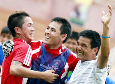 | Niềm vui của HLV Nguyễn Hữu Đang (phải) và các cầu thủ. |
