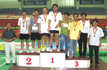 | Các vận động viên nhận thưởng ở nội dung đôi nam dưới 40 tuổi. |