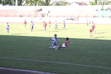 | Đội bóng Khatoco Khánh Hòa (trái) giành 3 điểm chật vật trước đội Navibank Sài Gòn. |