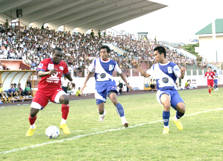 | Các cầu thủ Khatoco Khánh Hòa (phải) đã có một trận đấu nhạt nhòa trước Hòa Phát Hà Nội |