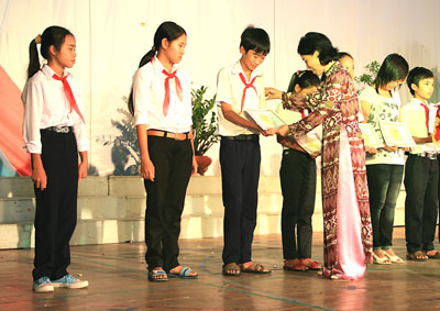 | Đại diện Ban tổ chức trao giải cho các em học sinh có tác phẩm xuất sắc |