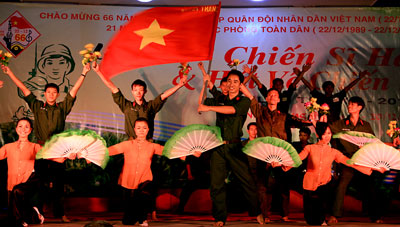 | Tiết mục “Chẳng kẻ thù nào ngăn nổi bước ta đi” của đoàn văn nghệ Bộ Chỉ huy Quân sự tỉnh. |