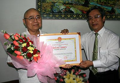 | Niềm vui của nghệ sĩ Nguyễn Đình Ảnh (trái) khi nhận được bằng khen của UBND tỉnh Khánh Hòa về những cống hiến của ông cho sân khấu kịch hát bài chòi. |