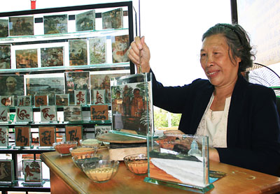 Diễn ra từ ngày 9 đến 15-6 tại Khu di tích Tháp Bà Ponagar, triển lãm tranh cát của CSTCNT Hồng Châu Sa ẩn chứa những nét hấp dẫn riêng của loại hình hội họa trên chất liệu cát. Đây không phải lần đầu tiên CSTCNT Hồng Châu Sa tham gia Festival Biển, nhưng để gây được ấn tượng đối với du khách không phải là điều đơn giản. Từ kinh nghiệm trong lần triển lãm tại Festival Biển 2009, đến với Festival lần này, CSTCNT Hồng Châu Sa đã chú trọng nhiều hơn đến chủ đề, kích thước, cách bài trí tác phẩm. Dự kiến, trong kỳ Festival này, CSTCNT Hồng Châu Sa sẽ trưng bày 200 - 300 bức tranh cát có kích thước từ 8cm x 12cm đến 25cm x 30cm. Với một khối lượng lớn tác phẩm, được chuẩn bị trong thời gian ngắn nên việc suy nghĩ đề tài cho mỗi tác phẩm là một thử thách đối với những người thực hiện. “Qua triển lãm lần này, chúng tôi muốn giới thiệu đến mọi người những hình ảnh về danh lam thắng cảnh, đời sống sinh hoạt của người dân Nha Trang - Khánh Hòa. Ngoài ra, bằng tình cảm chân thành đối với Chủ tịch Hồ Chí Minh, chúng tôi cũng thực hiện một số bức chân dung Bác Hồ”, nghệ nhân Trần Thị Thu - chủ CSTCNT Hồng Châu Sa cho biết. Đến CSTCNT Hồng Châu Sa những ngày này, chúng tôi nhận thấy không khí làm việc bận rộn của các thành viên. Mỗi người một việc, từ lựa cát, sấy cát, vẽ hình mẫu đến thực hiện tác phẩm… Công cụ thực hiện là những chiếc muỗng tự chế, những thanh tre vót nhọn đủ kích cỡ; chất liệu là những hạt cát đủ màu sắc được lấy về từ các địa phương trong tỉnh như cát đen ở vịnh Vân Phong, cát trắng, cát xám, cát xanh rêu ở vịnh Cam Ranh, cát vàng, cát đỏ được lấy từ bờ sông, suối… Dưới bàn tay tài hoa của các nghệ nhân, nghệ sĩ Hồng Châu Sa, những hạt cát vô tri, vô giác dần trở nên có hồn với nhiều sắc thái biểu cảm đối với người xem. Những danh lam thắng cảnh như Tháp Bà Ponagar, Hòn Chồng, núi Cô Tiên, vịnh Nha Trang…; những hình ảnh gợi nhớ về quê hương như dòng sông, bến nước, con đò, mái ngói rêu phong, những vườn cây trái sum suê… cảnh sinh hoạt, làm nghề của người dân miền biển hiện lên đầy sinh động. Đặc biệt, chân dung Bác Hồ được các nghệ nhân, nghệ sĩ tỉ mẩn thực hiện để toát lên được thần thái cương nghị khi Bác chỉ huy chiến dịch; vui tươi, ân cần khi tiếp xúc với bộ đội Hải quân nhân dân Việt Nam và giản dị với bộ áo nâu trong phút nghỉ ngơi giữa thiên nhiên. “Thể hiện chân dung Bác Hồ đã khó, thể hiện chân dung Bác bằng chất liệu cát lại có những cái khó riêng, đòi hỏi sự tìm tòi, sáng tạo của người nghệ sĩ mới mong thành công. Qua nỗ lực để hoàn thiện tác phẩm, chúng tôi đã thành công. Hy vọng, qua triển lãm, công chúng sẽ yêu thích những tác phẩm này”, nghệ nhân Trần Thị Thu chia sẻ.
