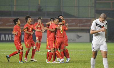 | Chiến thắng trước Đông Timor giúp thầy trò Huấn luyện viên Falko Goetz rộng cửa vào bán kết. Ảnh: Dân Việt |