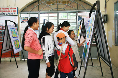 | Phụ huynh và học sinh xem tranh đạt giải trưng bày tại Nhà Thiếu nhi tỉnh. |