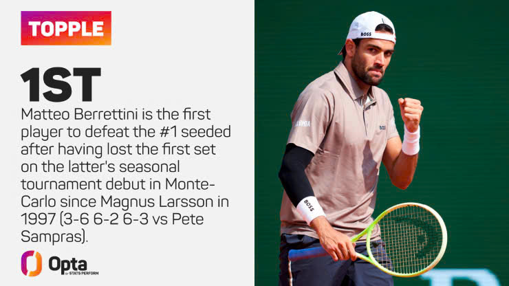 Với chiến thắng này, Berrettini đã trở thành tay vợt đầu tiên đánh bại hạt giống số 1 sau khi để thua séc đầu tiên tại Monte Carlo kể từ Magnus Larsson vào năm 1997, khi anh đánh bại Pete Sampras. Đây là kỷ lục đáng tự hào của tay vợt người Ý.